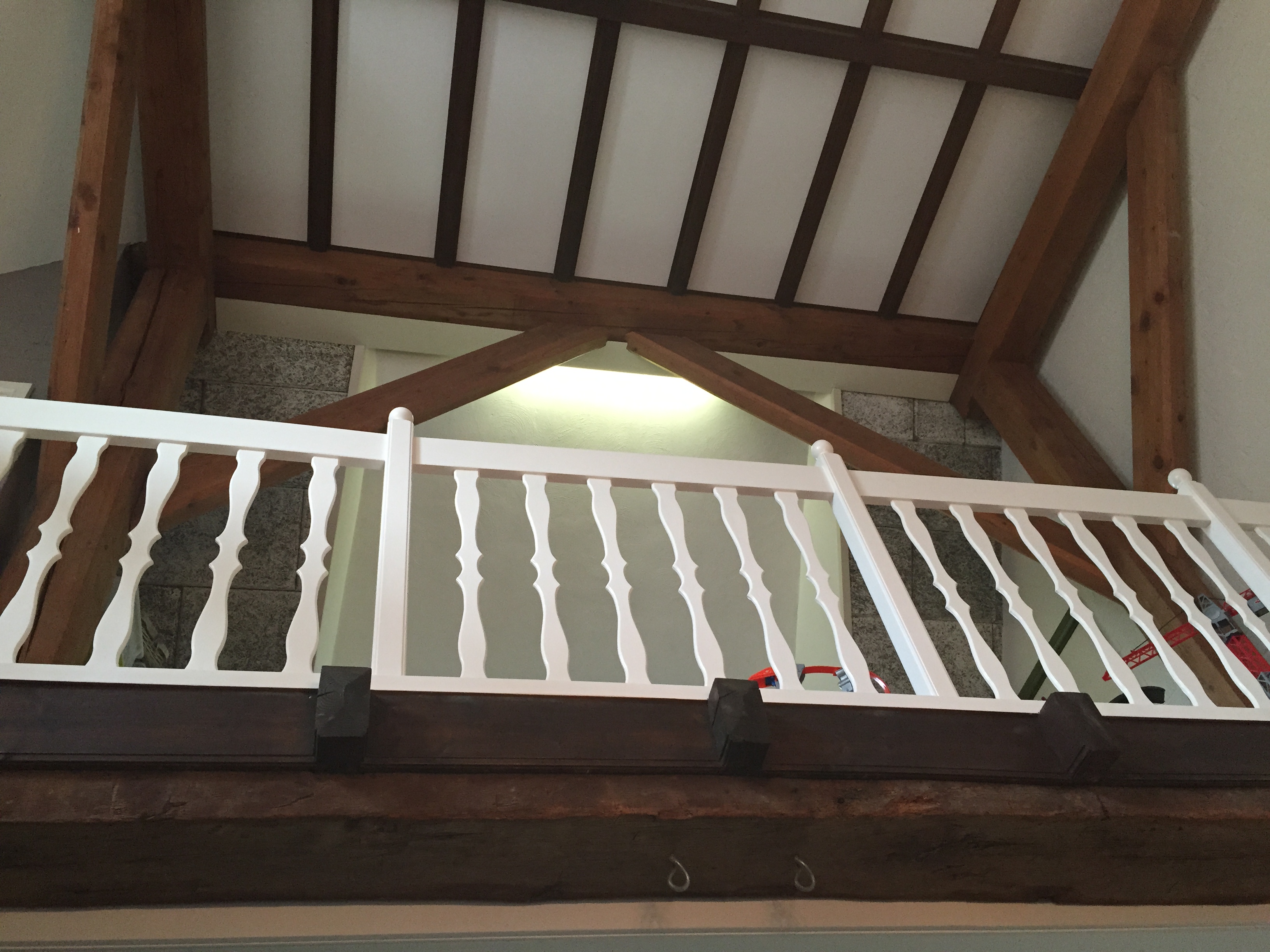 Some wood has been painted white which gives the stone floor and bricks on the wall even a more robust look