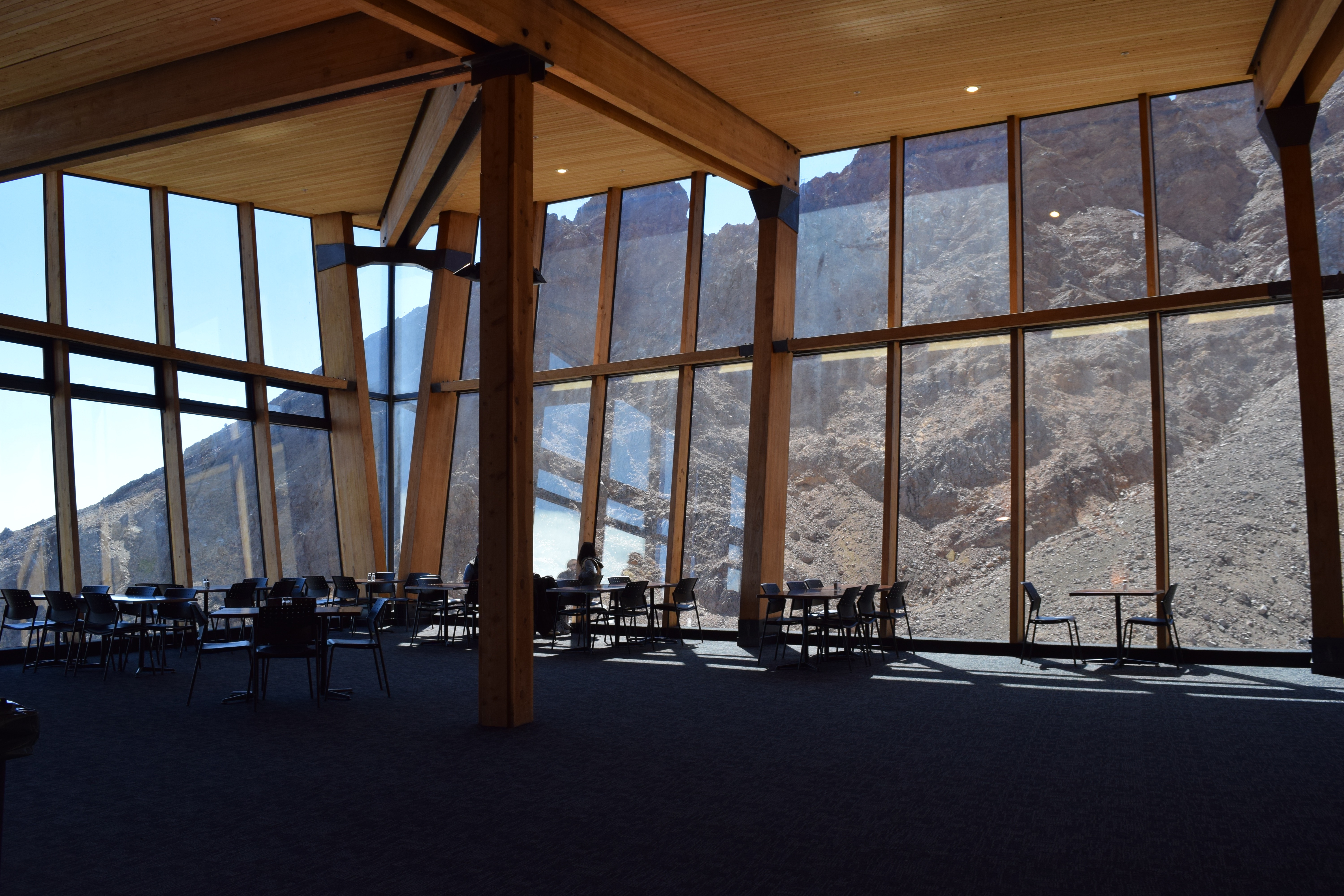 The restaurant has a perfect area inside, with a lot of glass where on a windy or rainy day you can stay warm and dry and look outside. The terrace outside the restaurant has an amazing view of the valley below.
