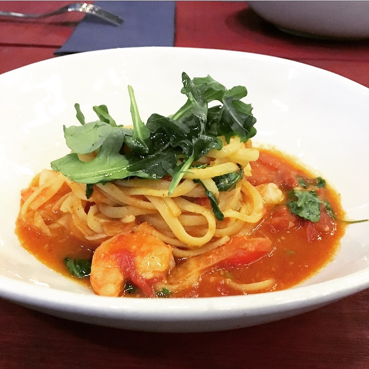 “Linguine with shrimps, garlic, venkel, tomatoes, chili, saffraan, fish bouillon and rucola”