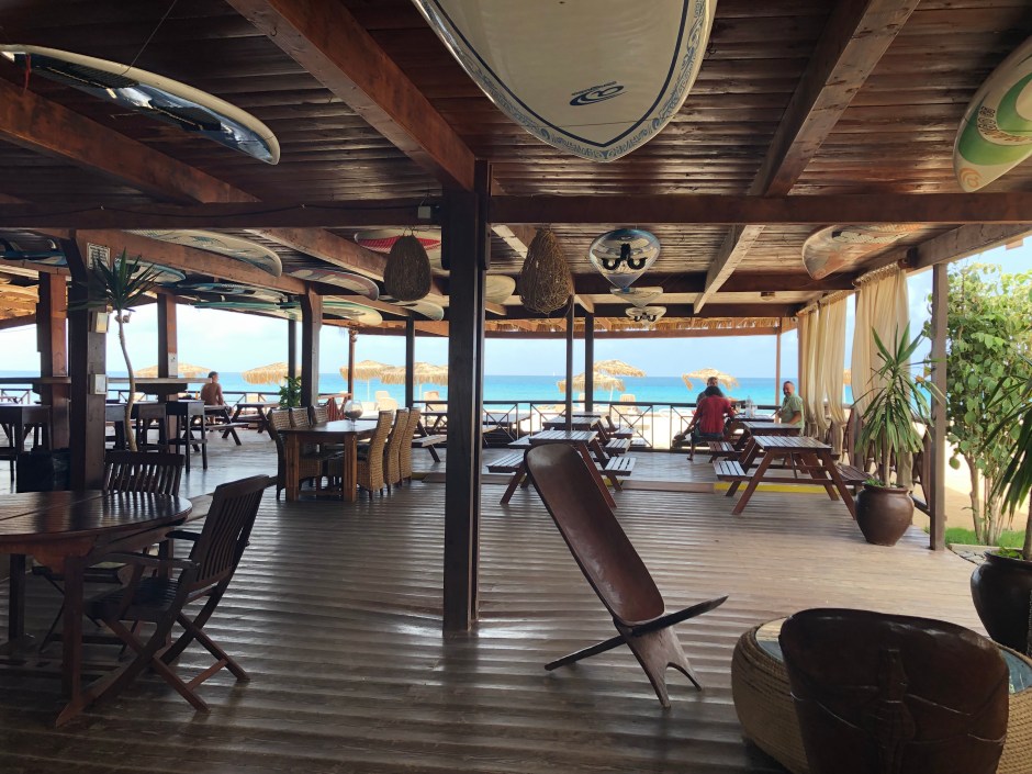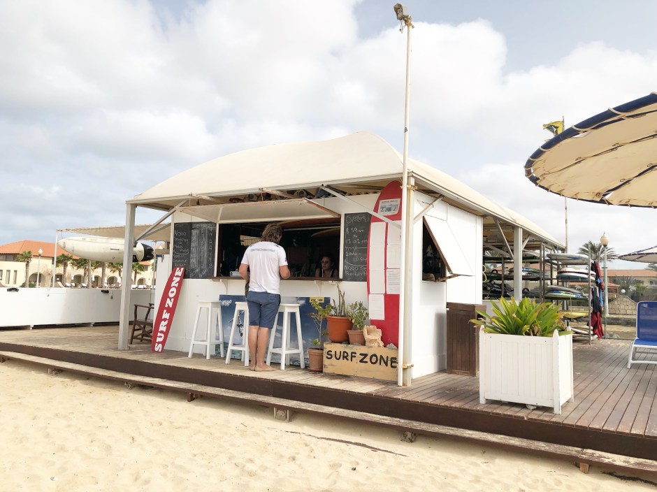 To the left of the dive centre, on the beach is a super cool restaurant. You can, among other things, follow Yoga on Monday, Wednesday and Friday morning from 7.30 a.m. to 8.30 p.m. We had put this on our list but we did not manage to be there so early. It’s vacation anyway, waking up slowly is so nice! On one of the last days I am wrote this blog in the super cool open restaurant. The restaurant that also has a surf school attached to it is beautifully situated on the beach. It is run by a couple, the man is from Hawaii and the woman is from here (Sal). 200 meters further on, they also incorporated a hotel with a lot of wood in the building. Who knows on our next visit that we will take an apartment or hotel near the pier.