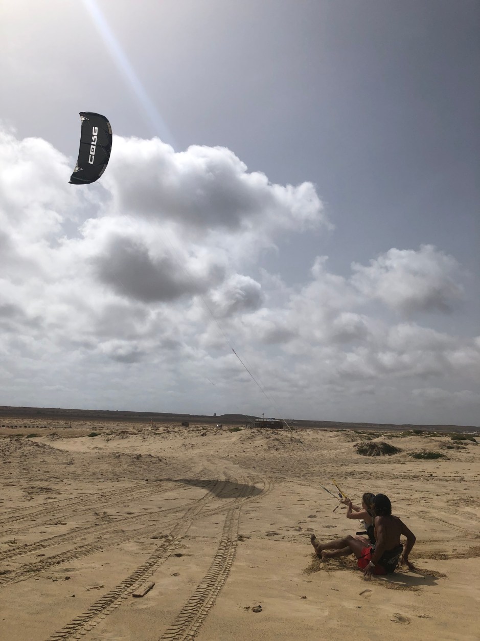 We take a taxi to Santa Maria towards the pier. A one-way trip from Hotel RIU Funana (5 minutes’ drive) costs 3 to 4 euros. In Cape Verde you can pay with Euro or Escudo. 1 Euro is 110 Escudo. To the right, about 100 meters from the pier we see the kite school that we contacted prior to arrival for kite lessons. I introduce myself to the people at the kite surf school and request for information on where we could best kit and foil on Sal. From the pier we take a taxi to “Kitesurf Beach”. This is around 10 minutes’ drive and costs 7 euros. The kite season is from December to February. Teresa, a cool lady and the only female taxi driver from Sal (she says) informs us that the sky is full of kites. According to Teresa, there are around 30,000 residents on the island and around 400 taxi drivers. The taxis (all in the same colour as light blue with a yellow line) are used almost exclusively by tourists. All taxis are owned by taxi drivers, they do not work for a company. People drive very well here.